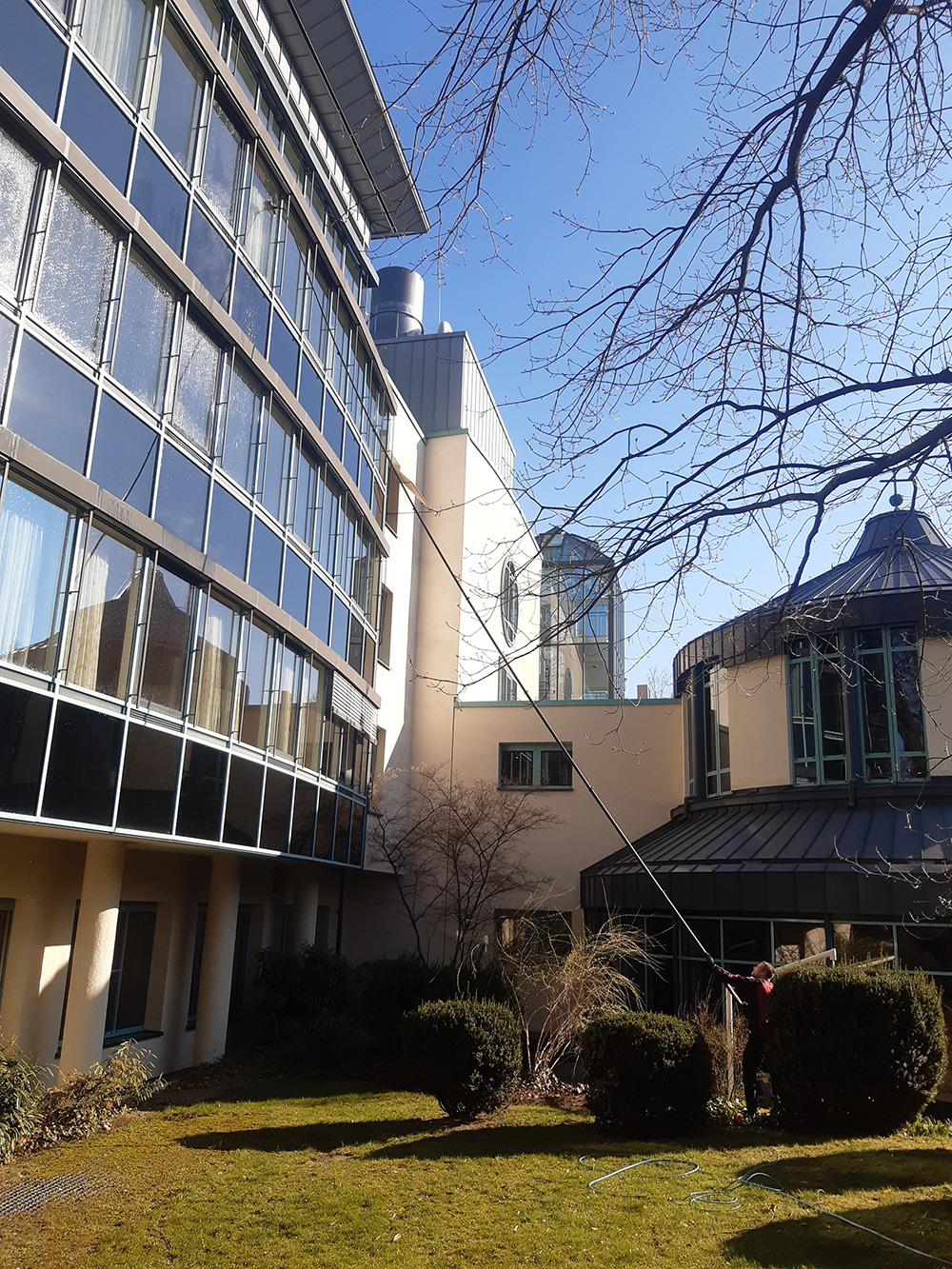Die Aufgabenstellung war, alles nur von außen zu reinigen. Mit Einsatz der Arbeitsstangen ( bis 20m ) und Osmoseanlagen wurde auch dieses Problem gelöst.
