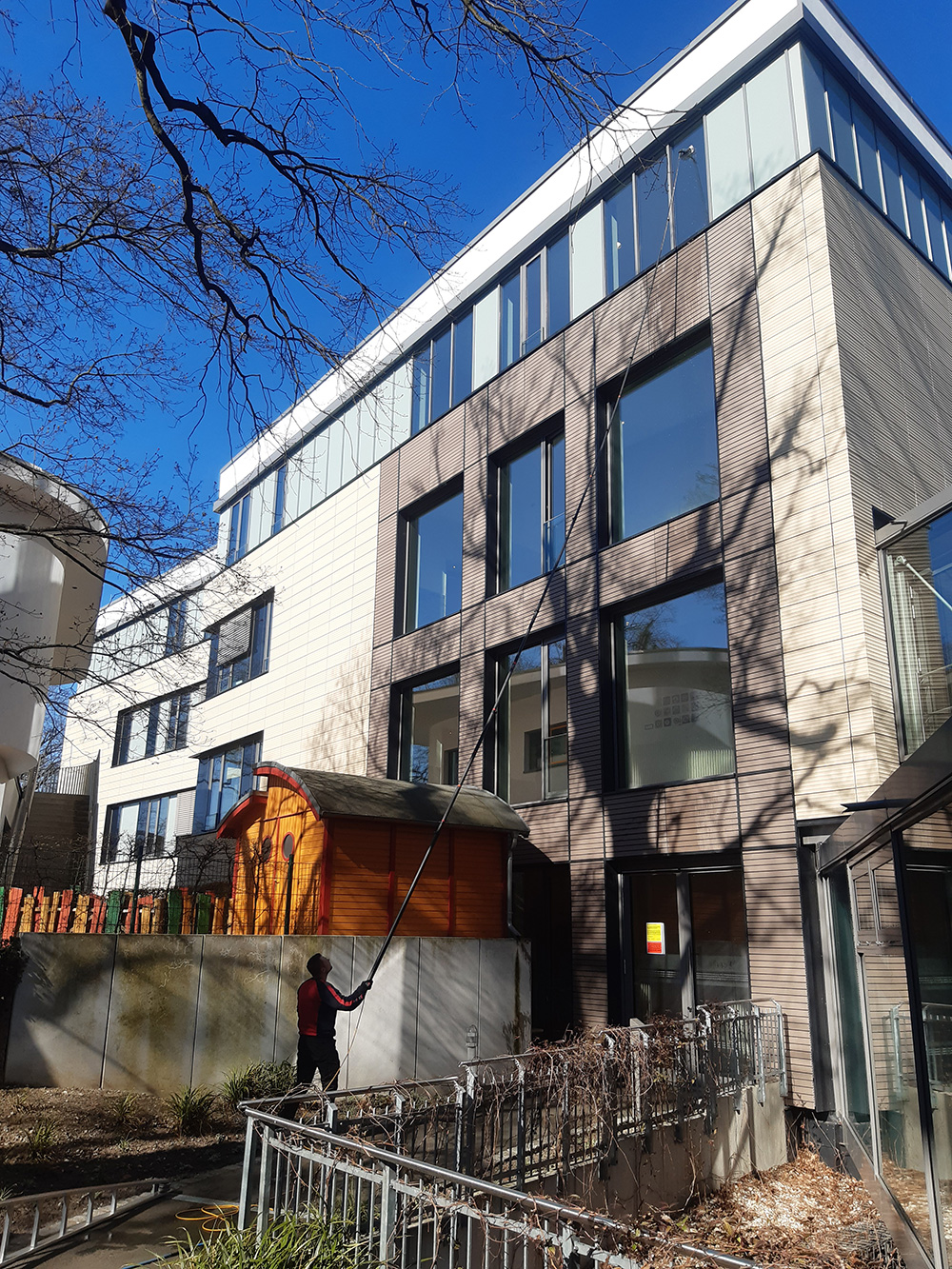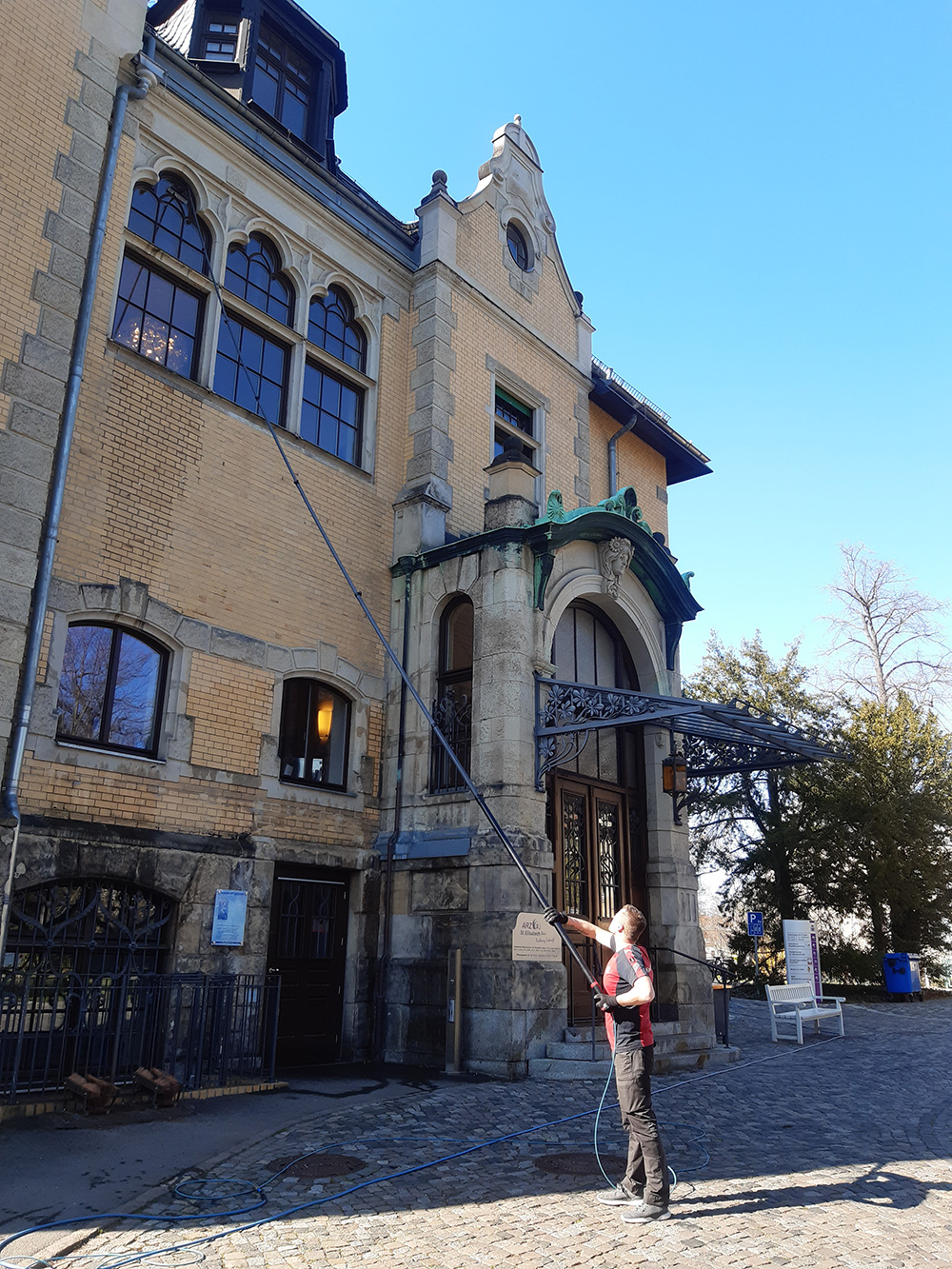 Die Aufgabenstellung war, alles nur von außen zu reinigen. Mit Einsatz der Arbeitsstangen ( bis 20m ) und Osmoseanlagen wurde auch dieses Problem gelöst.